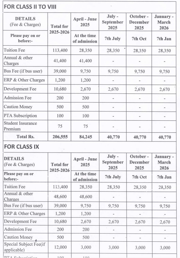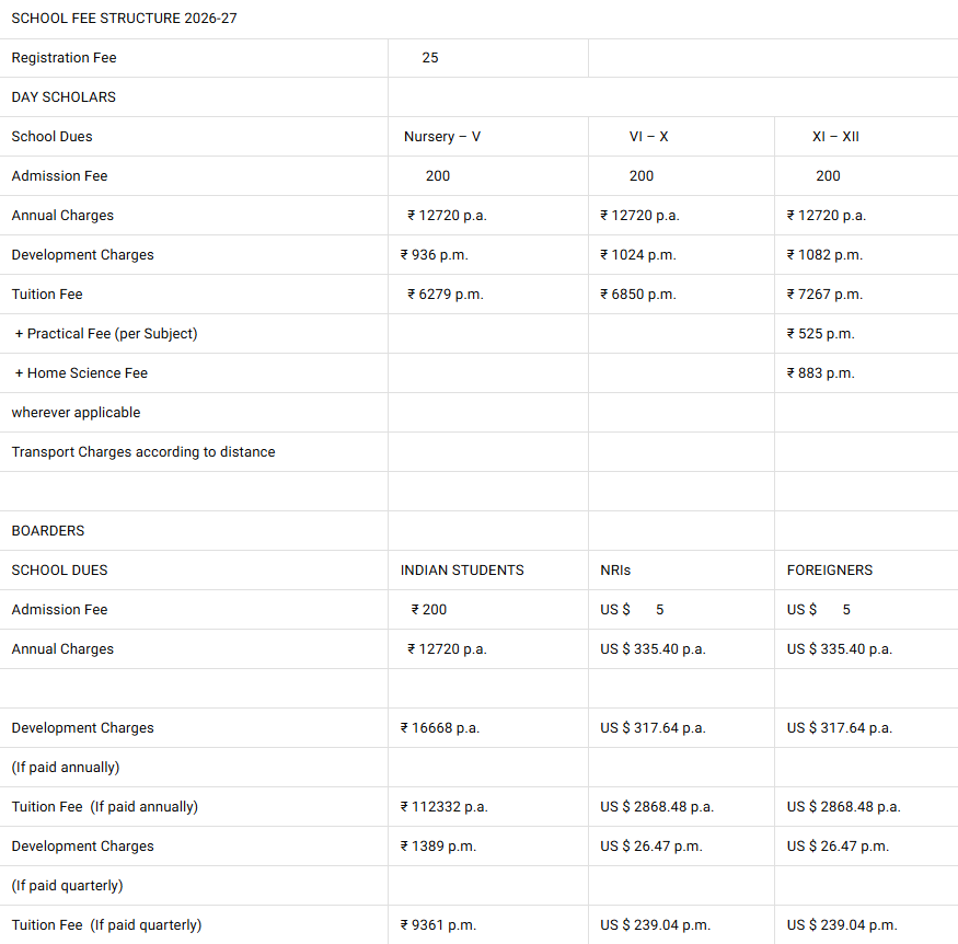 | Facilities | Artificial intelligence classes, robotics lab, abacus and vedic maths , science laboratories , boarding house, sports including swimming pool and hockey, yoga classes, dance, art and crafts, library, hobby clubs etc |