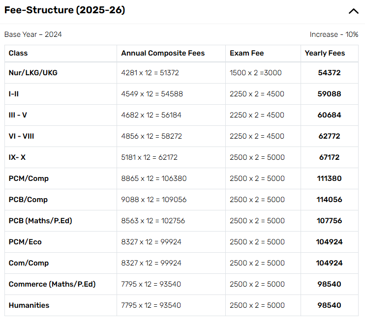 The fee from Grade 10 up to Grade 12 ranges from INR 60,912 to 72,372 per annum.