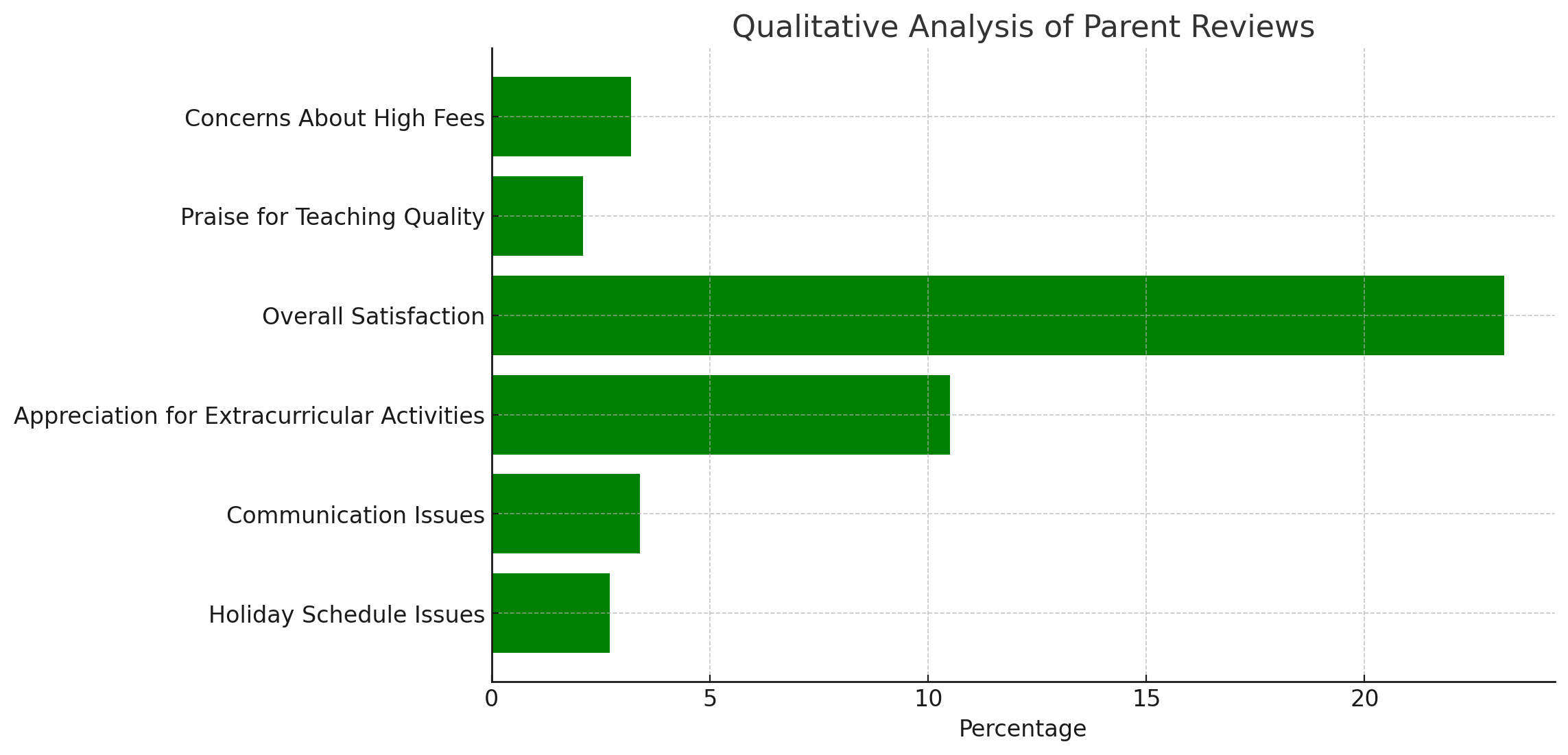 Teacher Support and Care (35%): The majority of parents and students appreciate the school's dedicated and supportive teachers who are willing to offer extra help.