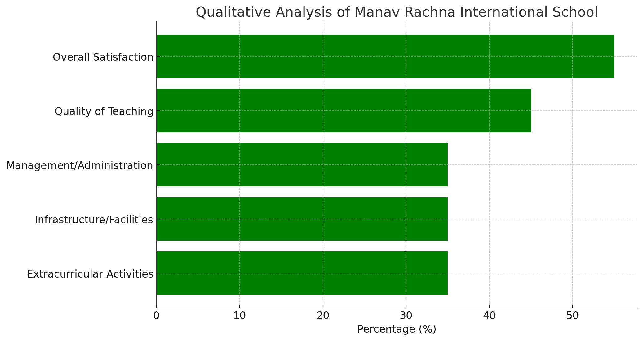 Overall Satisfaction: 55% of reviews express overall satisfaction, with a focus on holistic development and child-friendly approach, but also concerns regarding high fees and strict discipline.