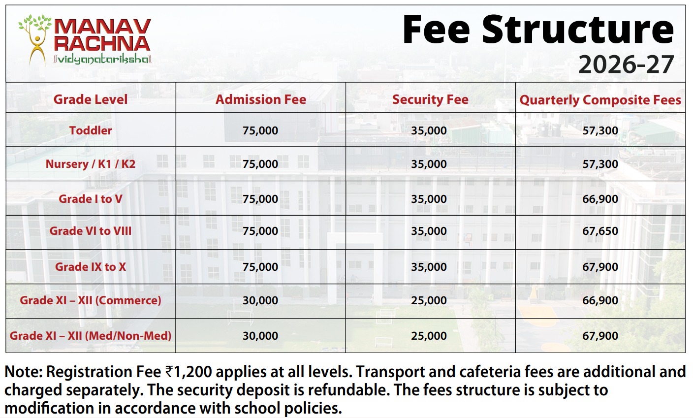 The composite fee(Quarterly) of Manav Rachna International School ranges from INR 50,500 for Preschool and KG to INR 60,000 for Grade 11TH & 12TH MED & NON MED
